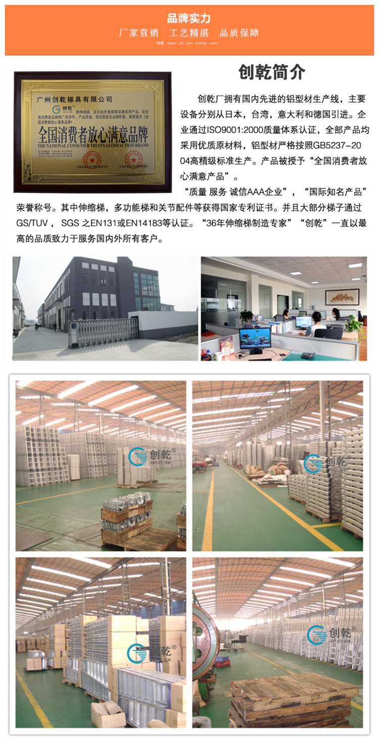 大連華峰白鋼鋁業有限公司吳先生深夜咨詢,只為選擇創乾便攜式登高人字梯。便攜式登高人字梯在市面上有很多款類似的產品,當然不能說創乾家的就是最好,但創乾梯子的的確確是實打實的做工。創乾便攜式登高人字梯采用6061T6鋁型材,外形美觀,攜帶方便,操作簡單,伸縮自如,占用空間小?扇我庹{節使用高度,承重高達150KG。通過SGS EN131認證并獲國家專利證書。用心制作,讓客戶放心的工程梯子,是我們創乾人的行事準則之一。