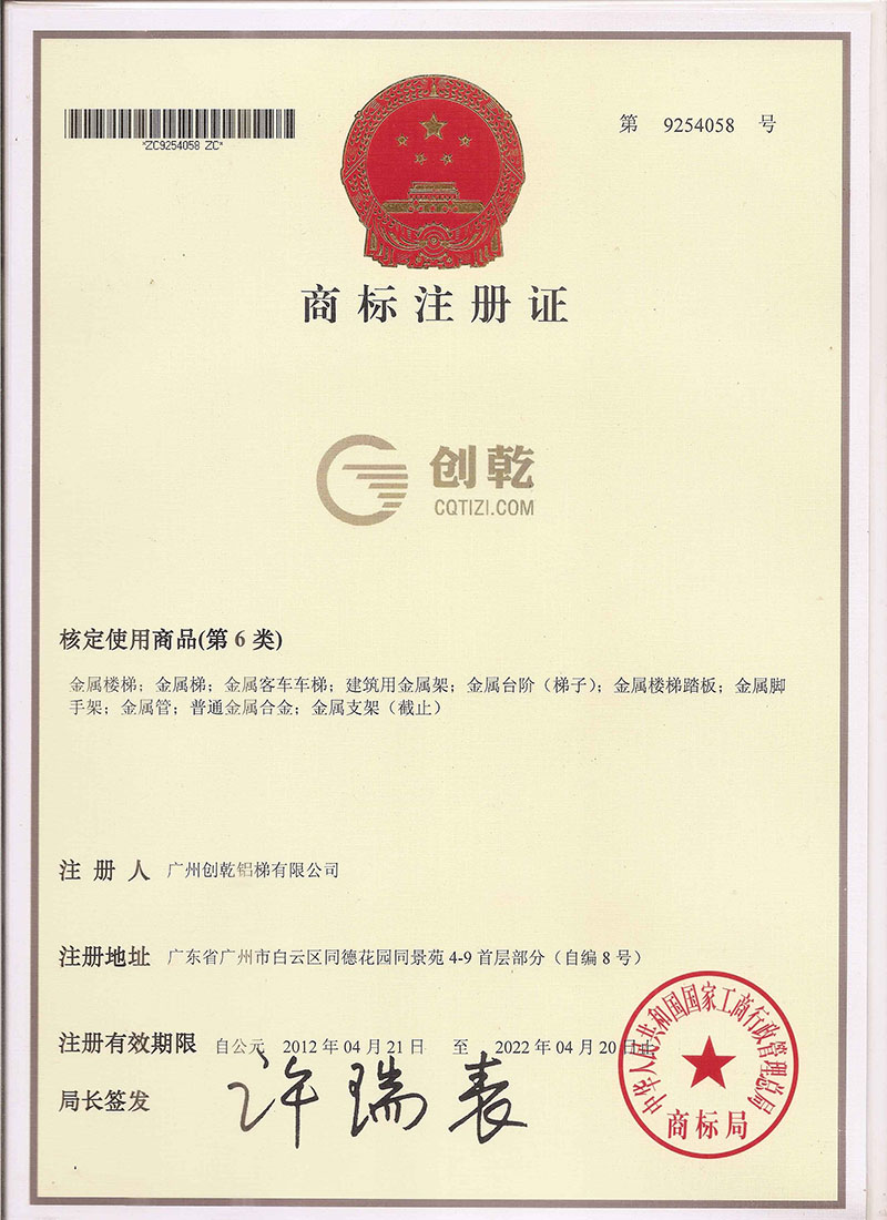 創乾商標認證-榮譽資質-伸縮梯子|折疊梯子|鋁合金梯子|梯子|廣東創乾梯具有限公司