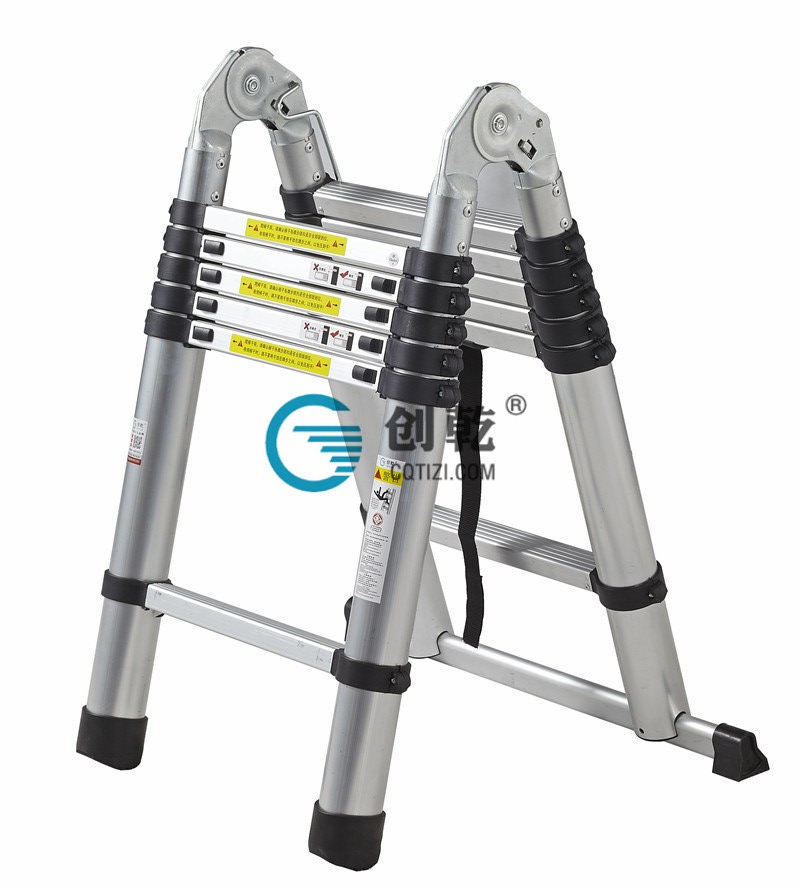 CQHM-4.4M人字伸縮梯每一節(jié)的圓管比別人的長9CM,重疊的越多,搖晃度越低。 2、材質(zhì)本身,我們用的材質(zhì)比別人不一樣,比別人更好看。安裝平衡桿時斜腳朝外,以使梯子在任何角度得到更大的平衡。使用時盡可能左右打開到最大角度。