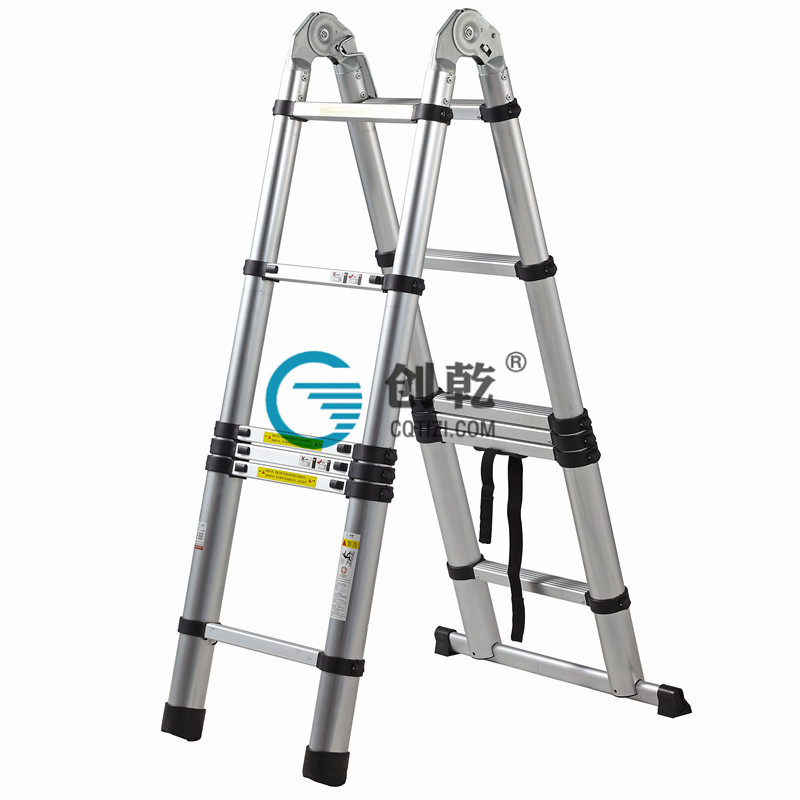 CQHM-5M兩用伸縮梯每一節的圓管比別人的長9CM,重疊的越多,搖晃度越低。 2、材質本身,我們用的材質比別人不一樣,比別人更好看。安裝平衡桿時斜腳朝外,以使梯子在任何角度得到更大的平衡。使用時盡可能左右打開到最大角度。