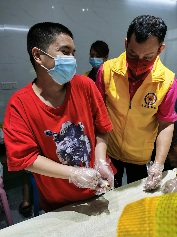 “腌制雞翅前,我們先用叉子在雞翅上扎幾個(gè)洞,能讓調(diào)味料更入味。”6月30日,在廣東省盲人協(xié)會(huì)、廣東省無(wú)障礙促進(jìn)會(huì)和廣東獅子會(huì)慈航服務(wù)隊(duì)共同舉辦的首屆居家康復(fù)訓(xùn)練營(yíng)暨盲人烹飪學(xué)習(xí)班啟動(dòng)儀式上,12名視障學(xué)員,在視障老師和志愿者的帶領(lǐng)下,開(kāi)啟了自己首次廚房烹飪之旅。學(xué)習(xí)無(wú)障礙烹飪廚具的使用方法、親手制作烤雞翅、現(xiàn)場(chǎng)削蘋(píng)果大賽……